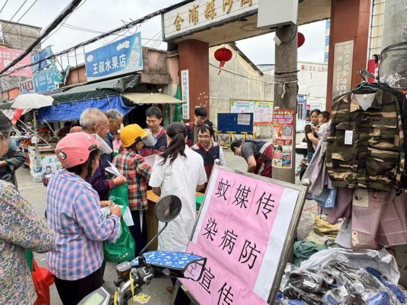 图4:市疾控中心(市卫监所)联合合浦县疾控中心(县卫监所)在沙岗镇卫生院大门通过发放科普手册和宣传礼品、现场讲解等多种形式,向群众细致普及蚊媒传染病防控知识